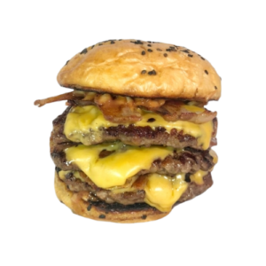 Burger de doble medallon, queso tybo, queso cheddar, queso roquefort, bacon y salsa big o alioli (a elección)